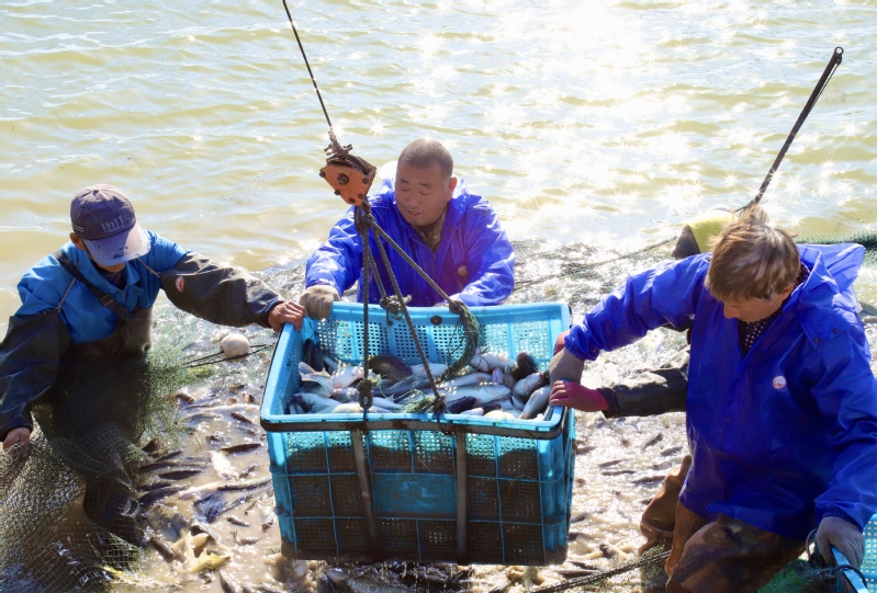 “起塘,出魚!”12月8日中午,在復興圩農場有限公司鱸魚養殖園區,集體養殖的加州鱸魚開始清塘出售,十幾名漁業工人正拖著漁網在精養魚塘里沿著塘口邊拖網捕魚,隨著漁網不斷收攏,成千上萬條鱸魚翻騰出水面,掀起陣陣浪花。