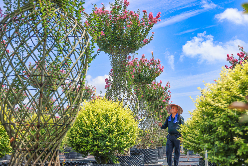 8月14日,在江蘇省鹽城市射陽縣,江蘇農(nóng)墾新洋農(nóng)場容器苗項(xiàng)目基地,管理人員正在養(yǎng)護(hù)紫薇花瓶。近年來,新洋農(nóng)場利用容器苗基地優(yōu)勢,在栽培方式上大膽嘗試,通過扦插培育,實(shí)現(xiàn)了自繁自育栽培技術(shù)的新突破,容器栽培的模式使苗圃成活率更高、綠化效果更好,優(yōu)良的品質(zhì)廣受全國各地綠化項(xiàng)目方的青睞。